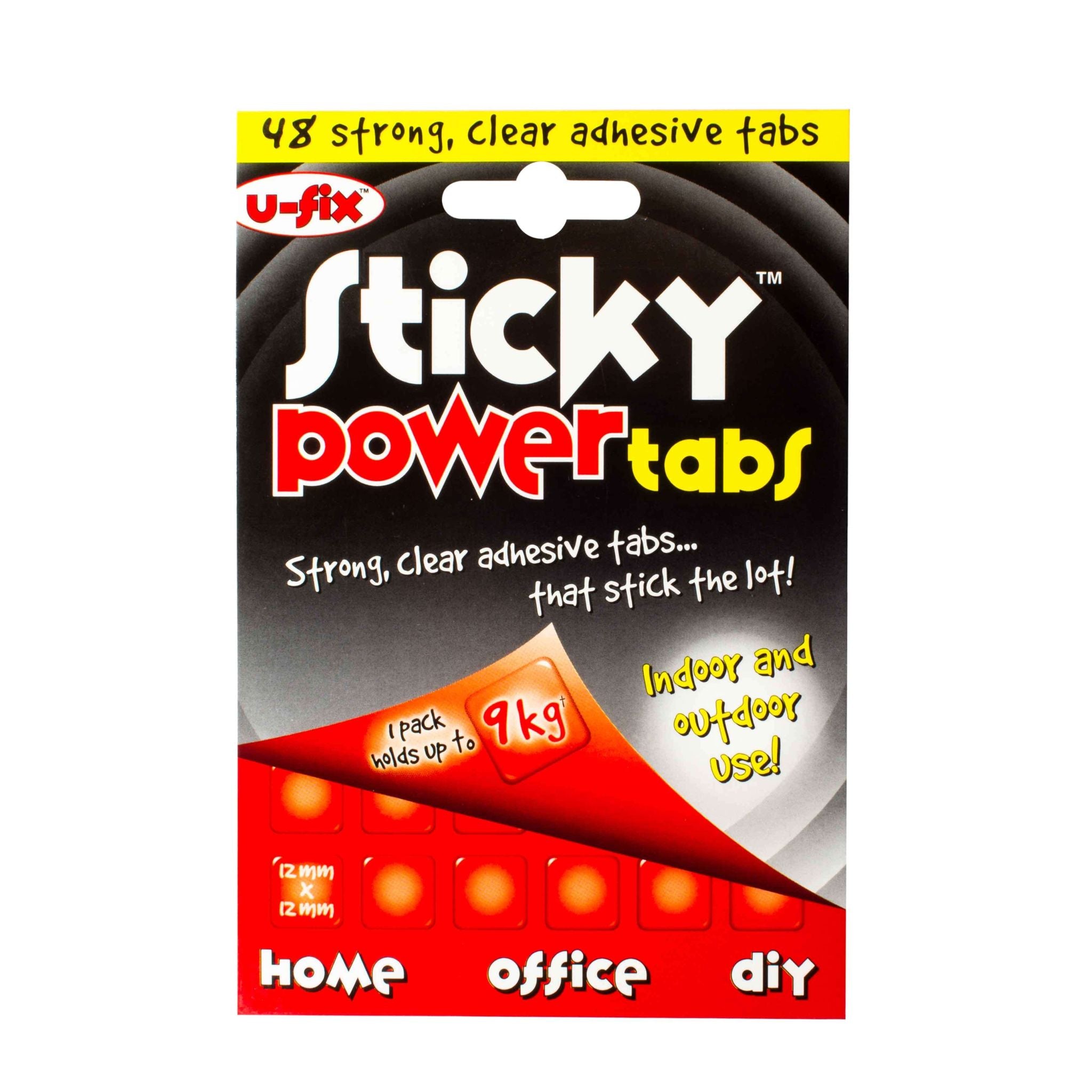 • U-Fix Sticky Power Tabs are strong, clear adhesive tabs that can be used instead of tapes, nails screws • Each pack contains 48 tabs • Tab size approx. 12 x 12mm • 1 pack can hold up to 9kg • Suitable for both indoor and outdoor use • Power Tabs work on most surfaces including metal, glass, plastics and ceramics • Heat, chemical, weather UV resistant • High strength • Instant stick • no drying time required • Easy to use • Power Tabs bond on contact without the need for clamping • Perfect for fixing signs indoors and outdoors without the need for power tools or fixings • Power Tabs can also be used to fix letterboxes, coat hooks, key hooks, racks, kitchen and bathroom accessories, cable trunking, skirting boards, dado and shower rails, fixing number plates, fixing trims on cars, glazing repairs in greenhouses, door and house...