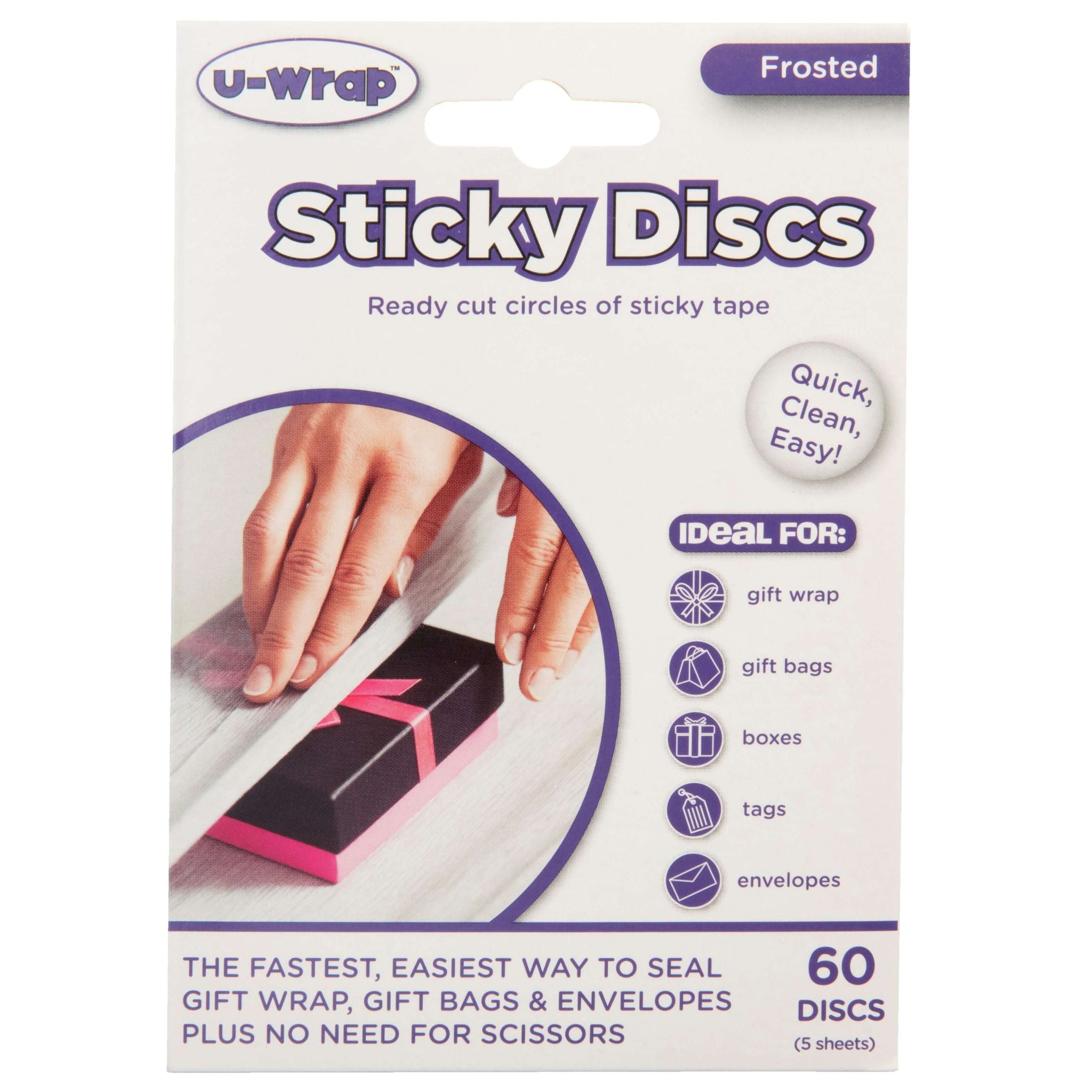 • U-Wrap branded Sticky Tape Discs • Each pack contains 60 frosted discs supplied on a flat sheet • Single sided ready cut circles of sticky tape • Perfect for gift wrapping, envelopes, gift boxes, lunch bags, parcels and much more • Simply peel and stick, no scissors required • Instant fixing, no drying time required • Permanent adhesive • Easy and simple to use • Solvent free, acid and lignin free • Size: 25mm diameter • Manufacturers barcode / Product Code: 5060048424577/ 202178