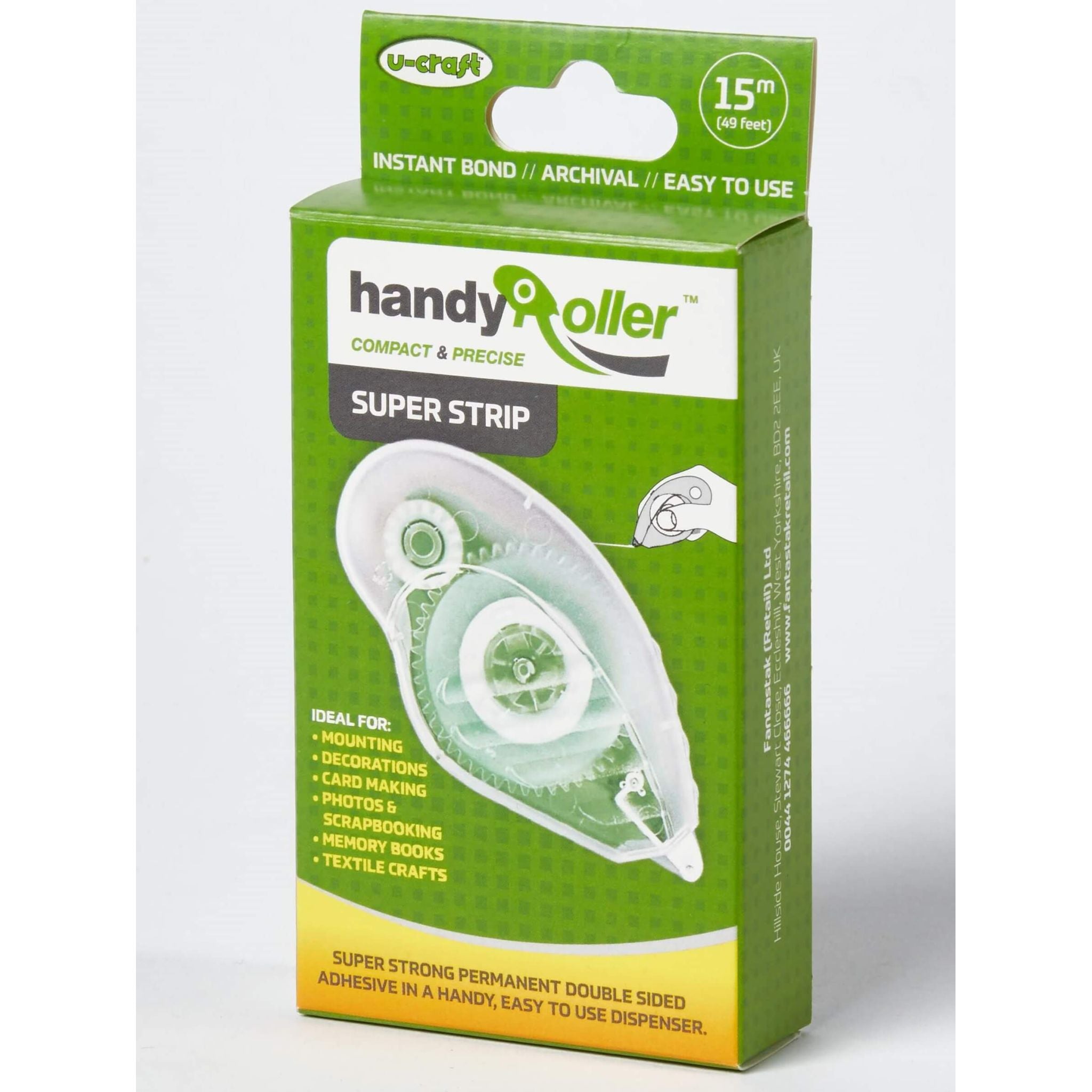 • U-Craft Handy Roller Super Permanent Strip • Ultra strength double sided adhesive tape, up to 5 times stronger than standard tape roller adhesive • The double sided tape is made up of tiny strips of adhesive which prevents the tape from "stringing" when applied • Handy, easy to use roller dispenser • Perfect for gift wrapping, envelopes, gift boxes, lunch bags, parcels, memos, mounting, decorations, card making, photographs and scrap booking and much more • Ideal for paper, textiles, card, cork, wood, fabric, glass, plastic and foam • Instant fixing, no drying time required • Permanent adhesive • Easy and simple to use • Solvent free and acid free • Size: 15m length of tape • Manufacturers barcode / Product Code: 5060048424645 / 202189