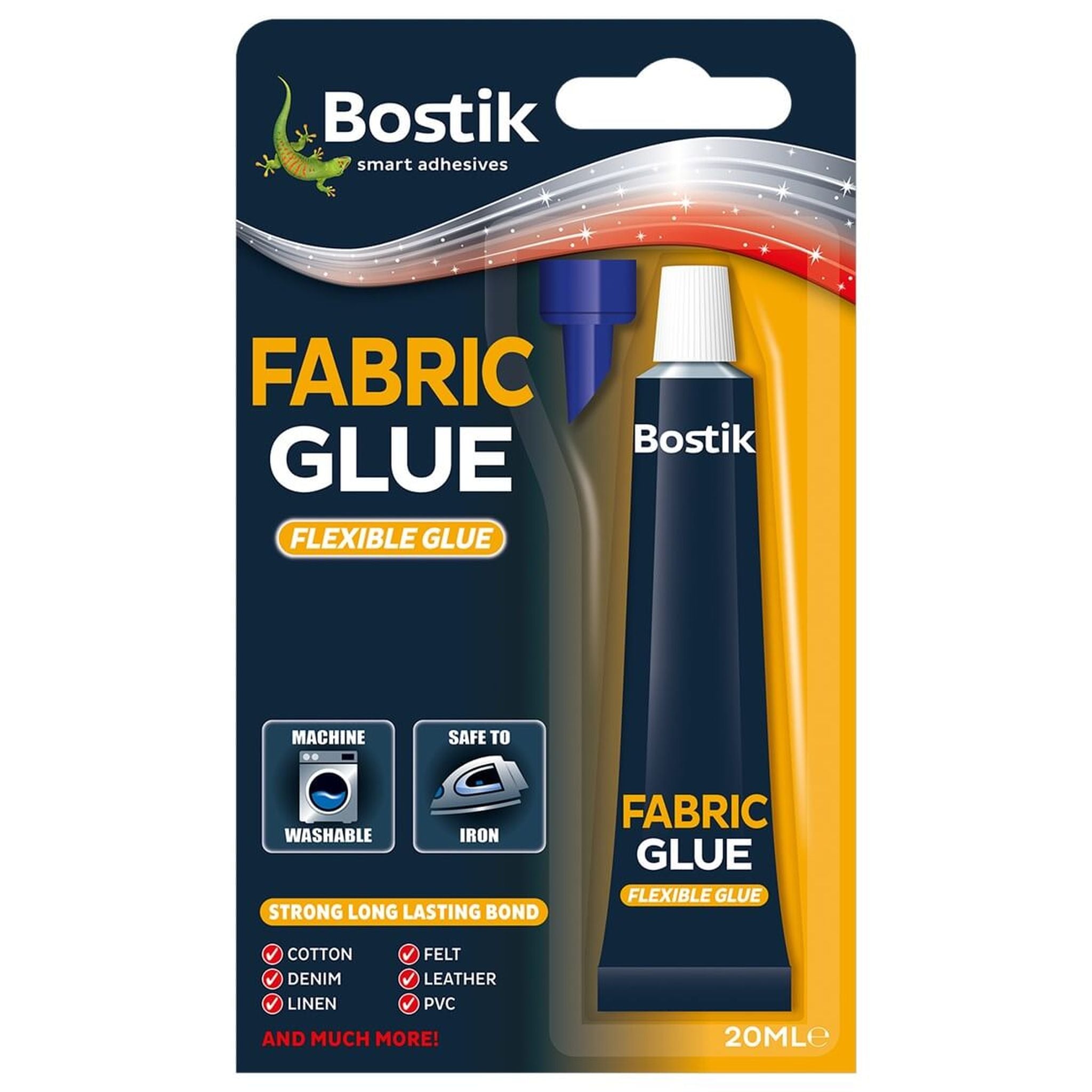 Bostik Fabric Glue is an ultra strong clear adhesive for fabric repairs and crafts. Its perfect for making long lasting, flexible bonds on porous fabrics such as cotton, denim, linen, felt, leather, PVC and much more, and can withstand machine-washing and ironing. • Completely removes the need for sewing and needles • Simply glue the fabric* together rather than sewing • Perfect for alterations, name badges, hems, labels and patches • Solvent Free • Advanced glue formula • Withstands machine washing and ironing • Quick drying • Includes easy spread nozzle • Glue dries almost clear • Manufacturer part number: 30614658 • 20ml tube • Fabric Adhesive does not work on 100% polyester or nylon fabrics add may damage delicate fabric. Always test a small area first