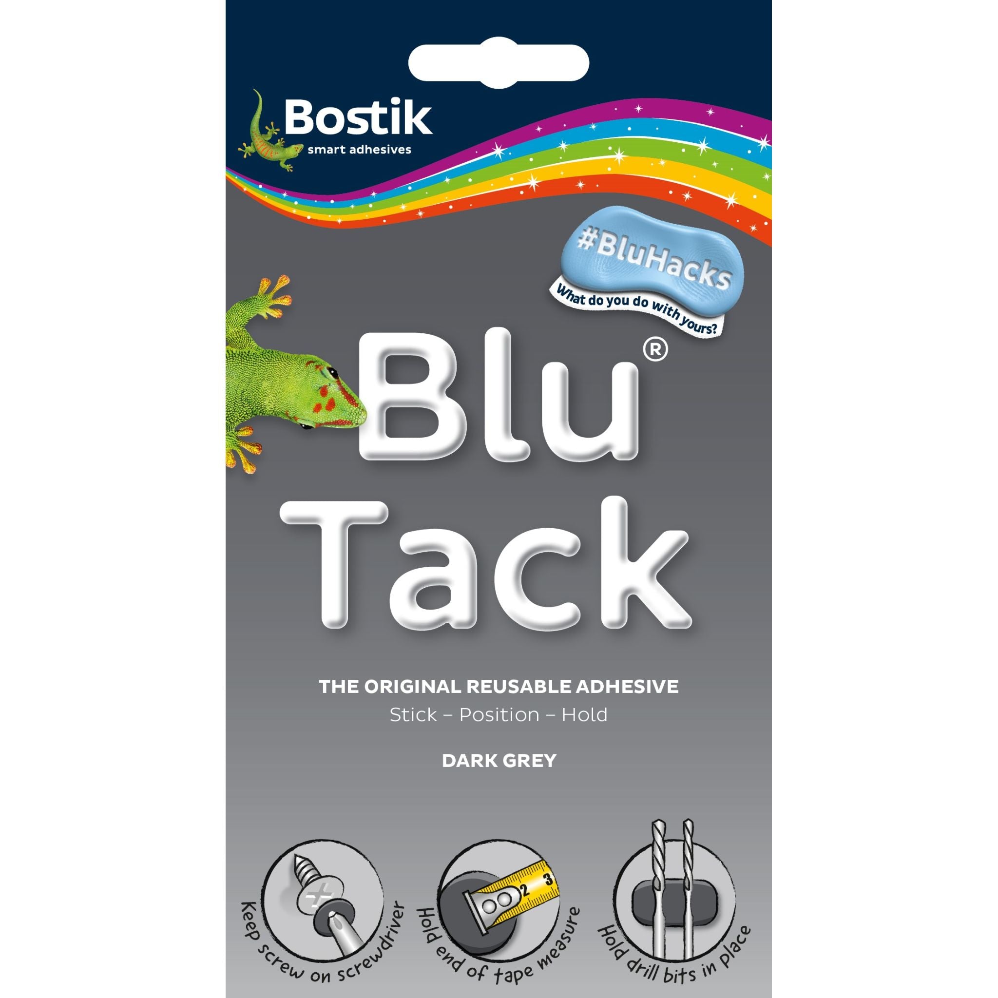 • Bostik Blu Tack • Grey • large pack • Clean grease free • Easy tear • Safe easy to use; instant fixing, no drying time • Perfect for sticking pictures, photos, timetables, small posters, menus, notices, decorations and much more • Very versatile • lots of uses around the home, office or school • Manufacturers barcode / Product Code: 5010591012424/ 30619627
