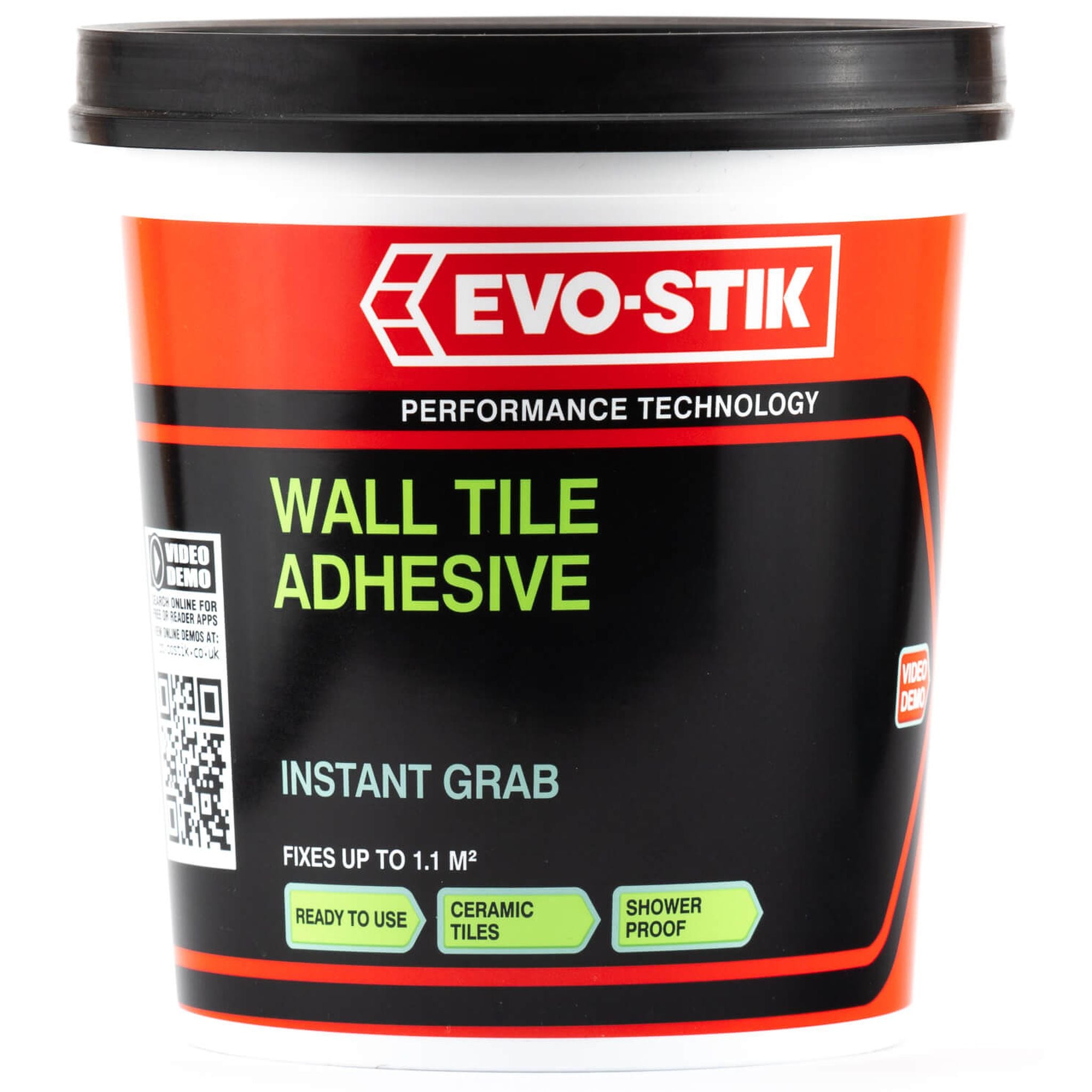 • Evo-Stik Instant Grab Wall Tile Adhesive. • Size: Economy • covers approximately 1.1 square metres. • Ready mixed (no mixing messy powders). • Suitable for ceramic tiles. • Shower proof. • Extra strong, instant grab formulation. • Suitable for fixing onto most surfaces including plaster, plasterboard, glazed tiles, brick, marine plywood, cement and cement renders provided they are rigid and clean. • Manufacturers part number 416611. • Pot size: Approximately 1 Litre. • Colour when dry: Natural. • Manufacturers part number / barcode: 416611 / 5010591999671